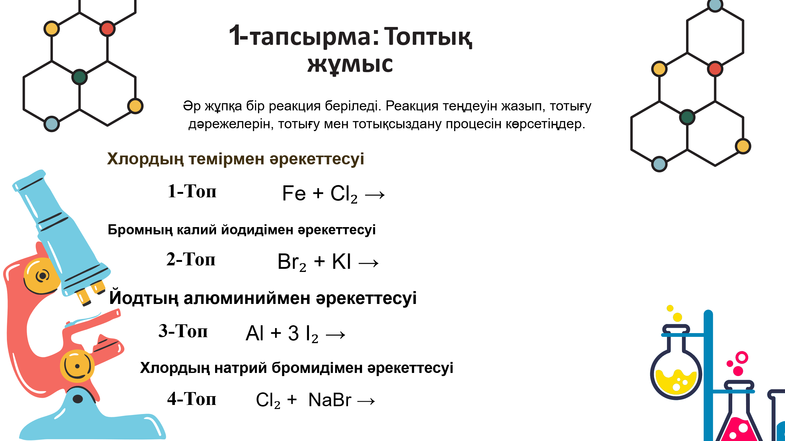 Жаңа сабақ. ЖИ жасаған бейнеролик арқылы ақпарат береді. 1-тапсырма. Топтық тапсырма Әр жұпқа бір реакция