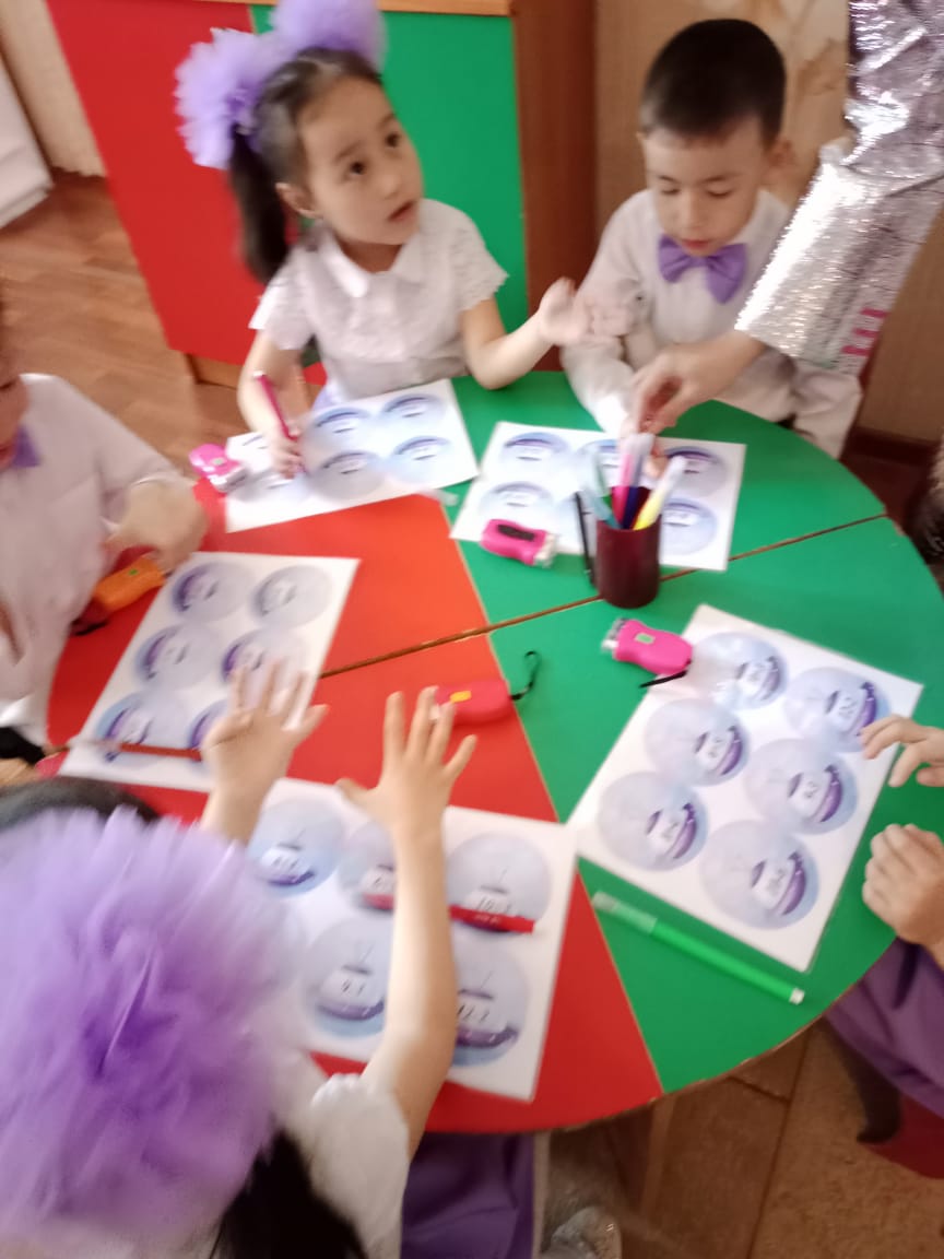 амандасады Ойынға белсене араласады Тақтадағы суреттерді санау ретімен орналастырады -ғарыштың Тамашалайды Амандасады. Балалар жарыса сұрақтарға жауап береді Байқоңыр