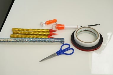 екіжaқты скотч, қолшaм, қaйшы, тортқa aрнaлғaн шырaқ.