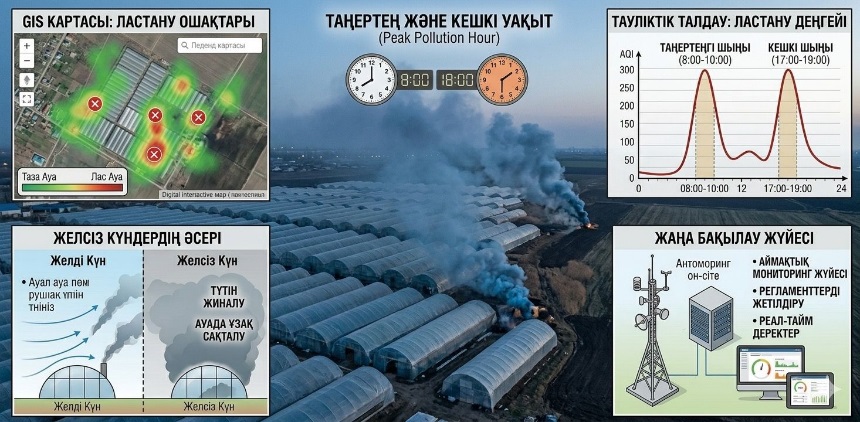 Жүргізілген бақылау және талдау жұмыстары барысында жылыжайлар шоғырланған аймақтарда ауа сапасының төмен екені анықталды. Атап айтқанда: