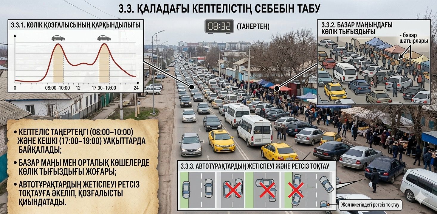 Базар маңы мен орталық көшелерде көлік тығыздығы жоғары;