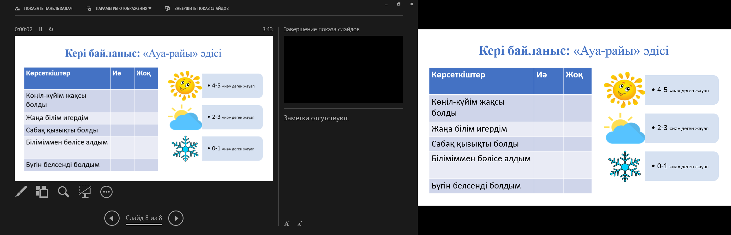Сұрақтарға жауап беріп, өткенді еске түсіреді. Тақырыпты ашады, алдарына мақсат белгілейді. Нұсқаулықты тыңдайды, қалаулары бойынша таңдалған тапсырманы орындайды, дәптерге түртіп алады, жұпта жұмыс жасап, бірін-бірі бағалайды. Нұсқаулықты тыңдайды, ноутбуктерді пайдаланып, сандық платформада тапсырманы жеке орындайды. Топтарға сараланып отырады. Нұсқаулықты тыңдайды, топта тапсырманы орындайды. |