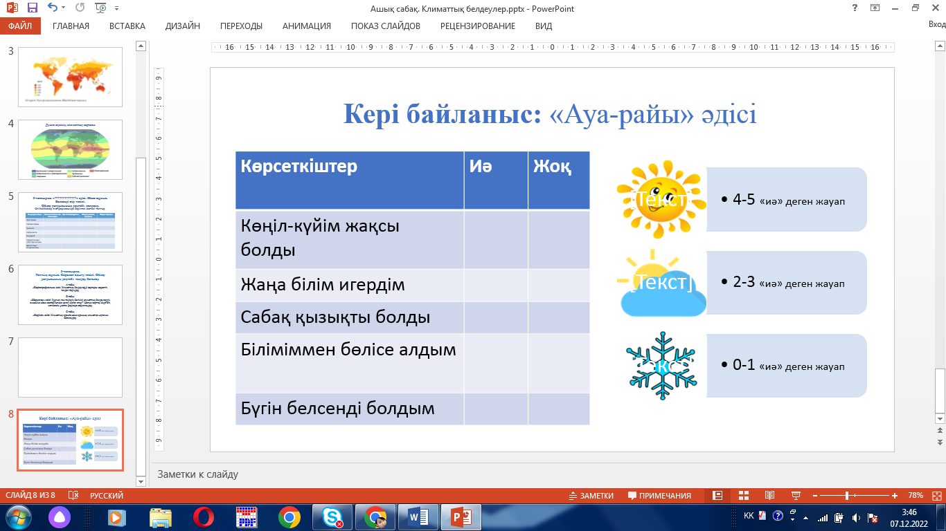 Өткенді еске түсіру. Тақырыпты ашу (қызықты ақпарат арқылы) Оқу мақсатын анықтау Мағынаны тану үшін балаларға тапсырманы таңдау еркі беріледі. 1-тапсырма. «Ойлан, жұптас, бөліс» әдісі. Жұптық жұмыс. Бірлескен оқу тәсілі. Ойлау дағдысының деңгейі: талдау. Бейнеролик және контекстпен жұмыс жасау арқылы кестені толтыр және жұпта талқыла. 2-тапсырма. «Кім жылдам?» әдісі. Жеке жұмыс. Белсенді оқу тәсілі. Ойлау дағдысының деңгейі: қолдану. OnlineMektep платформасында берілген кестені толтыр. Мониторинг нәтижесі бойынша оқушыларды 3 топқа саралап отырғызып, деңгейлік тапсырма беру. 3-тапсырма. Топтық жұмыс. Саралап оқыту тәсілі. Ойлау дағдысының деңгейі: талдау, бағалау. А тобы. «Картографиялық» әдіс. Климаттық белдеулерді картадан көрсетіп, сәйкес өлең шумақтарымен сипаттаңдар. В тобы. «Жариялау» әдісі. Құрлық пен теңіздің бөлінісі климаттық белдеулердің өлшеміне және секторлығына қалай ықпал етеді? Шағын зерттеу жүргізіп, нәтижесін ұнаған формада жариялаңдар. С тобы. «Көрініс» әдісі. Климаттың адамға және адамның климатқа ықпалын бағалаңдар. |