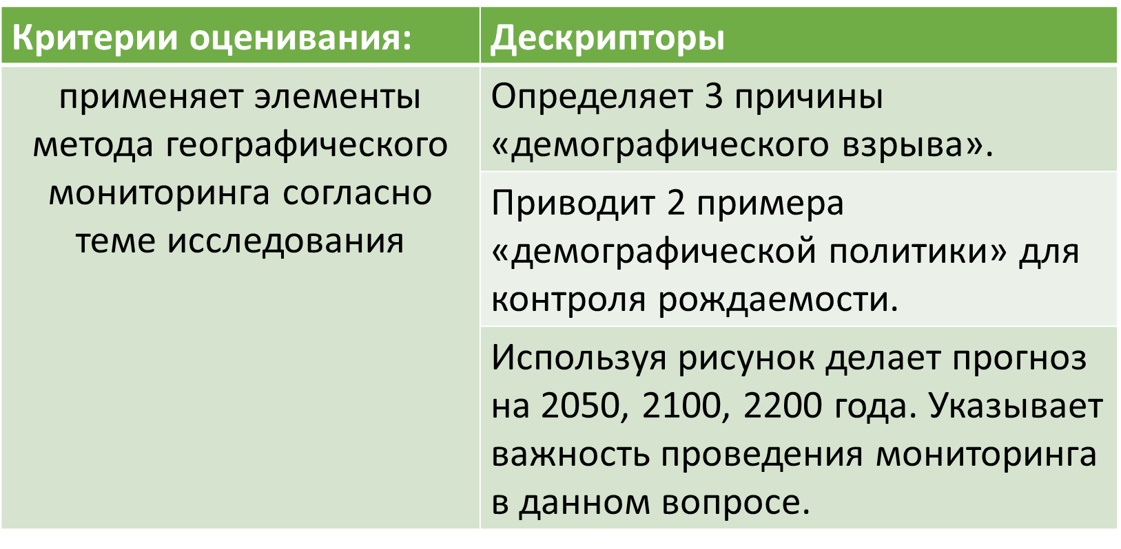 Обсудите вместе последствия демографического взрыва. Учащиеся должны уже в этом отрезке урока понять о необходимости проведения мониторинга по данному вопросу (проблеме).Ознакомившись с текстом и рисунком (демографический взрыв) учащиеся выполняют следующие задания согласно критериям оценивания (15 минут): Критерий оценивания: