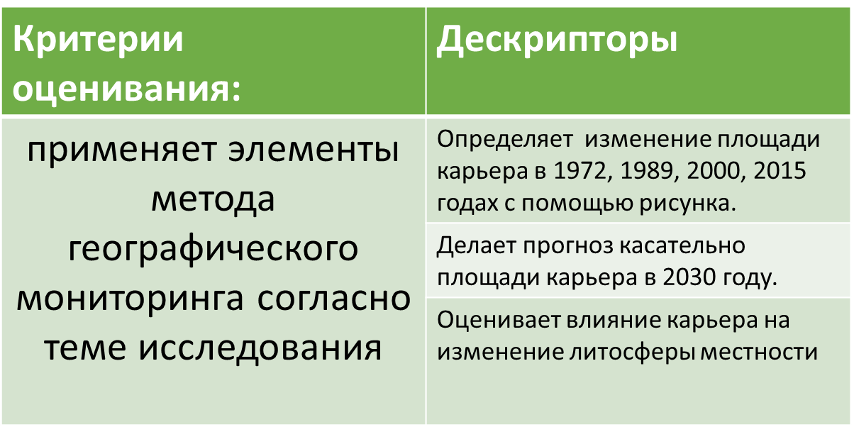 Разделите учащихся на пары. Работа с рисунком (10 минут). Карьер Эскондида – крупнейшие карьер добычи меди в западном полушарии. На сегодняшний день наличие терриконов и каьеров в данном регионе Чили привело к масштабным изменении рельефа. Изучив рисунок (карьер Эскондида), определите, как изменилась точка А в 1972, 1989, 2000, 2015 годах и как в будущем (2030 году) это месторождение может измениться? Критерий оценивания