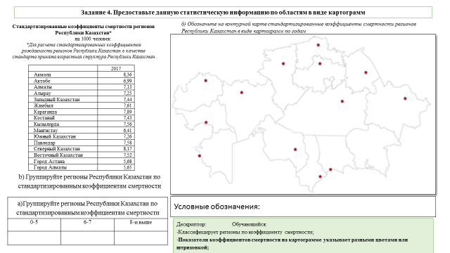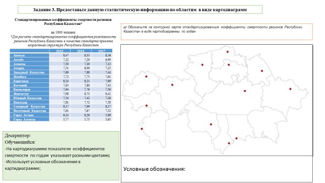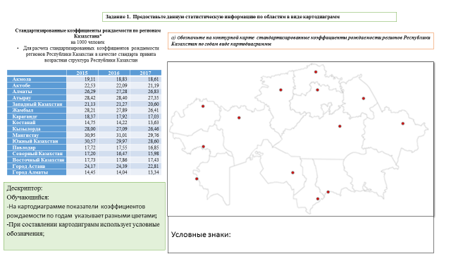 Учащиеся, отвечая на вопросы, определяют цели урока. ІІІ. Деятельность учащихся на уроке. Работа в парах: 1. Задание. Используя нижеследующие статистические сведения, необходимо построить диаграмму, отражающую процентное соотношение национального состава населения Казахстана. Национальный состав населения Казахстана. В республике, кроме казахов, проживают представители более 131 национальностей. По результатам переписи 2013 года, этносостав населения представлен следующим образом: казахи - 65,2%, русские - 21,8%, узбеки - 3%, украинцы - 1,8%, уйгуры - 1,4%, татары - 1,2% , немцы - 1,1%, корейцы - 0,6%, турки - 0,6% . После выполнения задания пары меняются работами с другими группами и оценивают их. Дескриптор оценки. 1. Умеет определять процентное соотношение. 2. Сопоставляет национальный состав. 3 Задание №2 Работа в группах. Используя данные тексты, изучает демографическую политику двух государств (рождаемость, смертность, естественный прирост, продолжительность жизни) и сопоставляет их (на примере Китая и Казахстана). Составляют прогнозы на будущее.