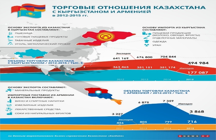Практическая работа. Индвидуальное работа Задания 1.Используя инфографику, сравните торговые отношения Казахстана с Кыргызстаном и Арменией в 2012-2015 гг: А) определите общее и различия в экспорте и в импорте Казахстана с Кыргызстаном и Казахстана с Арменией; В) сравните по годам объемы торговли Казахстана с Кыргызстаном и Арменией; С) предположите торговые отношения Кыргызстана и Армении; D) сделайте вывод об торговых отношениях Казахстана с Кыргызстаном и Арменией в 2012-2015 гг.