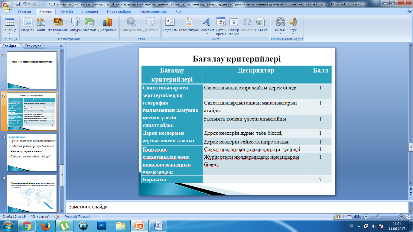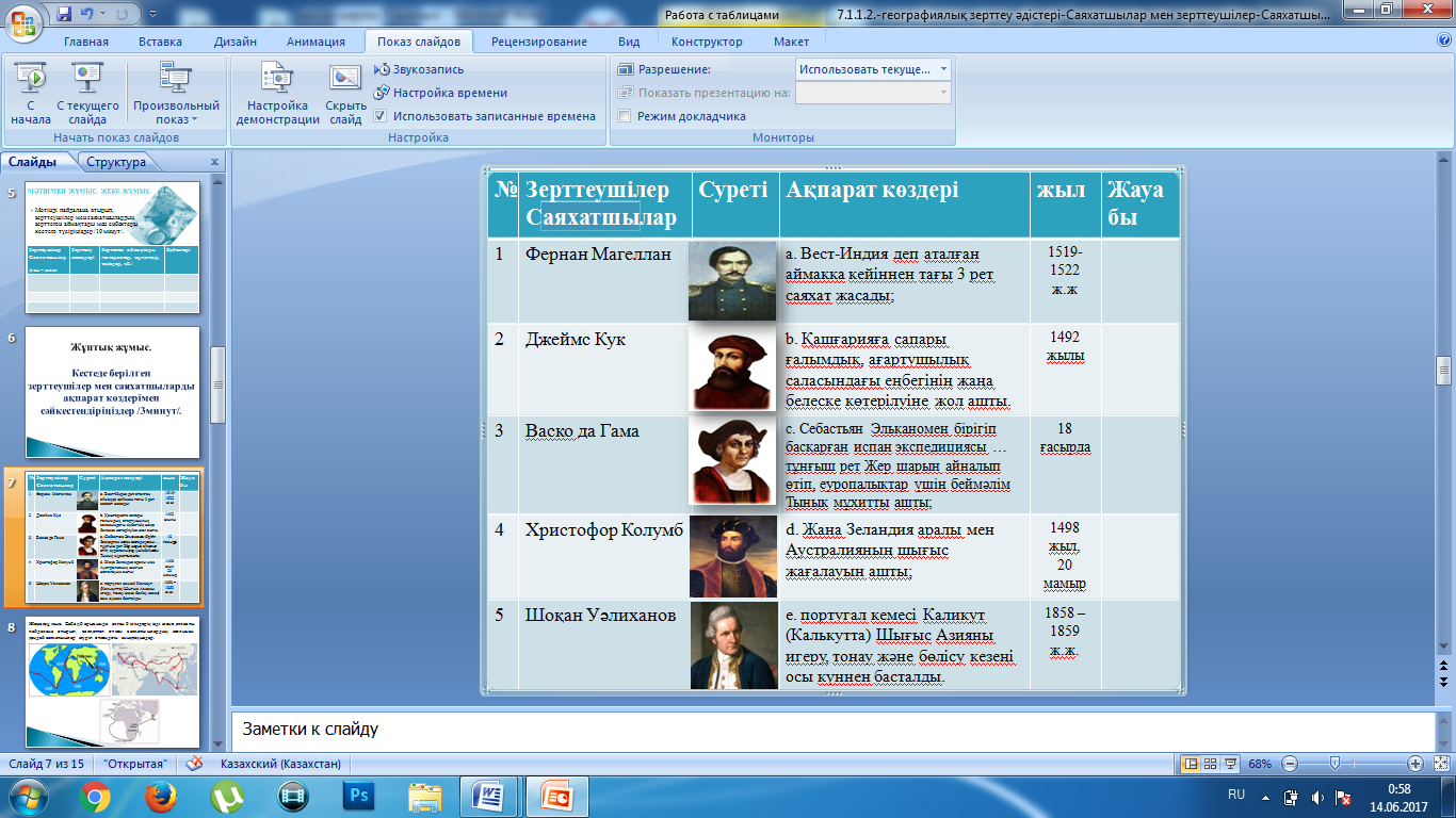 7.1.1.2 –саяхатшылар мен зерттеушілердің география ғылымының дамуына қосқан үлесін сипаттап, баға береді |