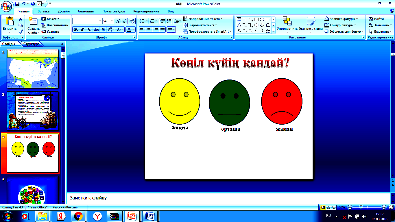 «Қызығушылықты ояту үшін миға шабуыл. Ұйымдастыру кезеңі: Амандасу, оқушыларды түгендеу Оқушылардың көңіл-күйін бақылау. Ынтымақтастық атмосферасын орнату: Қатысушылар шеңбер құра отырады. Ортада сиқырлы қобдиша тұрады. Сыйлықтар қағазға жазылған. Мысалы: карта, компас, желбағдар т.б. Жаттығу шарты:Қобдишадан әр қатысушы кезекпен бір сыйлықты таңдап алып, ішінде жазылған сөзді лайықты деп санаған адамға сыйлайды. Сыйлықтар үлестіргенен кейін, шеңбер бойынша өзінің сыйлығын айтады. Оқушылардың өткен сабақ бойынша білімдерін сұрақтар арқылы еске түсіру. Адамдар қандай әдістерді қолдана отырып, табиғатты оқып үйренеді? «КЕҢІСТІК» ұғымына кластер құрғызу. Рефлексия: Қоршаған орта да осы сыйлыққа сізді лайық деп таныса, жеке-жеке қошемет көрсетейік. Сыйлықтарыңыз құтты болсын |