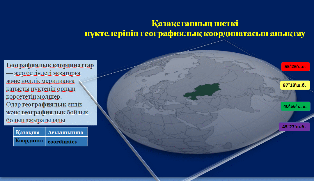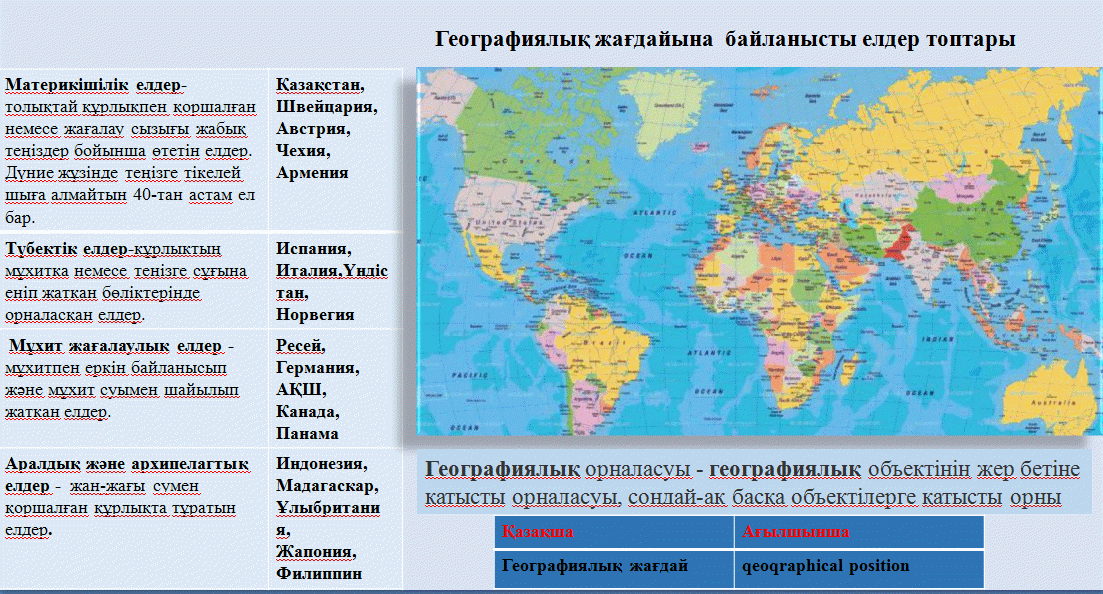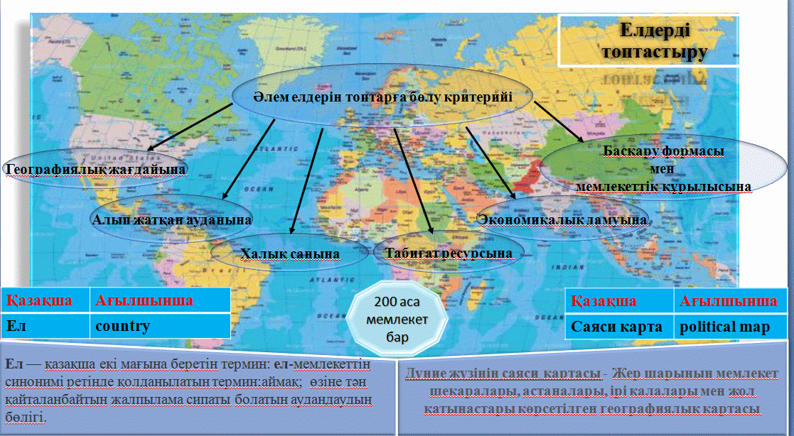 Аумағы үлкен елдер, микромемлекеттер, Халқның саны көп елдер, Табиғи ресурстарға бай елдер, Табиғи ресурстарға кедей елдер, бір ұлтты елдер, Көпұлтты елдер, ЭГЖ түрлерін түсіндіреді. Картаны қолдану арқылы Қазақстанның географиялық төлқұжатын жасай алады |