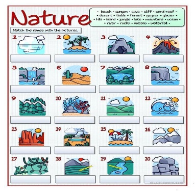 1.Working with new vocabulary. 1.Forest-Орман- 2.Coast-Жағалау 3.Mountain-тау 4. River-Өзен 5.Steppe-Жазық дала 6.Valley-Алқап 7.Desert-Шөл 8.Lake-Көл 9-Waterfall-Сарқырама 10.Volcanо-вулкан(жанартау)