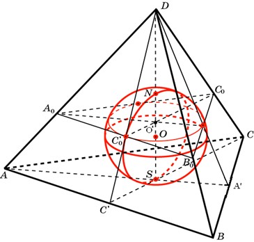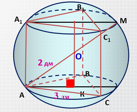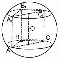 Сфераға іштей салынған призма. Теорема Егер призма тік және оның табанына сырттай шеңбер сызуға болатын болса, онда призмаға сырттай сфера сызуға болады. 1. Сфера центрі бұл-призма табанына сырттай сызылған шеңбер центрлерін қосатын кесіндінің ортасы (яғни призма биіктігінің ортасы). Мысал 1. Диаметрі 4 дм-ге тең сфераға табанының ұзындығы 3 дм-ге тең дұрыс үшбұрышты призма іштей салынған. Призма биіктігін табыңыз.