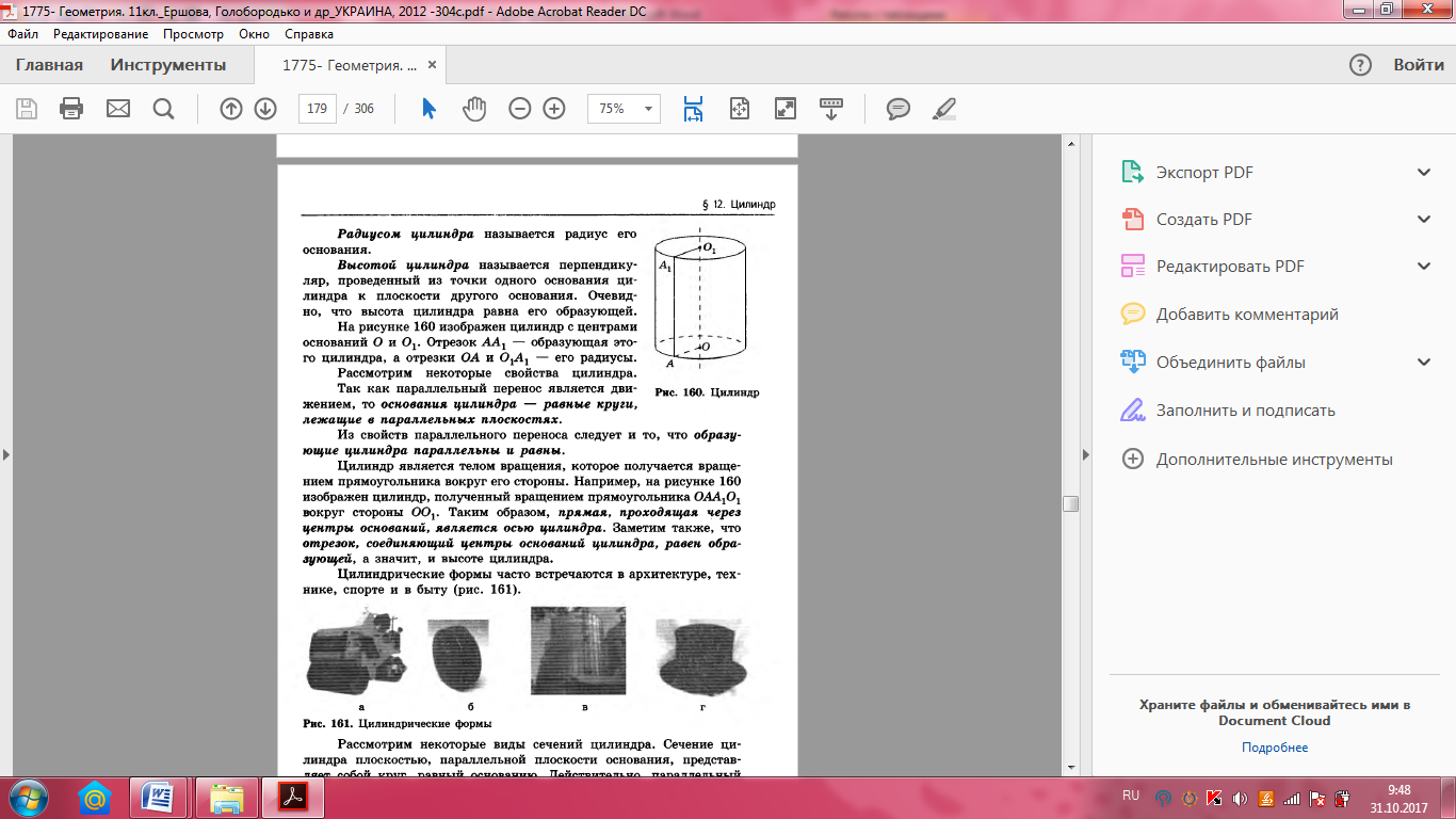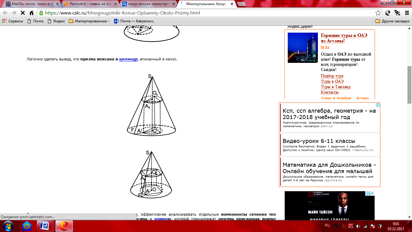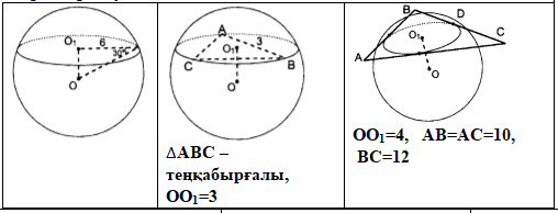 Үй тапсырмасы: A) Шардың және оның бөліктерінің көлемін табу формулаларын қорыта білу; https://resh.edu.ru/subject/lesson/4910/main/23242/ B) Қуыс шардың диаметрі 18. Сыртының қалыңдығы 3. Шар дайындалған материалдың көлемін табыңдар. C) Сфера қабырғалары 12-ге тең ABCD квадратының төбелері арқылы өтеді. OD радиусы квадрат жазықтығымен 600 бұрыш жасаса, сфераның центрі О нүктесінен квадрат жазықтығына дейінгі қашықтықты табыңдар. D) Цилиндрдің жазбасы тік төртбұрыш. Жазба диагоналі 8 және табан жазықтығымен 300 бұрыш жасайды. Цилиндр көлемін табыңыз. |