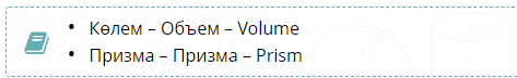 11.3.12 – призма көлемін табу формуласын білу және оны есептер шығаруда қолдану; |