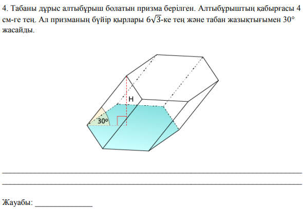 132. №4.Көлбеу призманың бүйір қыры 10 см және ол табан жазықтығымен 300 бұрыш жасайды. Призманың биіктігін табыңдар.Жауабы: 5 см. №5.Тік призманың табаны – катеттері 6 см және 8 см болатын тік бұрышты үшбұрыш. Үшбұрыштың гипотенузасын қамтитын бүйір жағының диагоналі 26 см. Табу керек: призманың биіктігін, призманың бүйр бетінің, призманың толық бетінің аудандарын табыңыз. Жауабы: 24 см, 576 см2, 624 см2. №6.Тік призманың табаны – сүйір бұрышы 300 тең ромб. Призманың бүйір беті 96 см2, толық беті 132 см2. Призманың биіктігін табыңдар. Жауабы: 4 см.