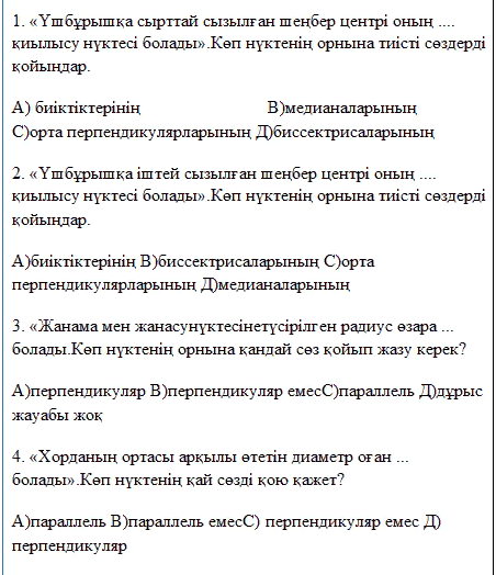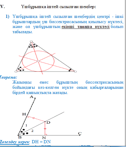 7.1.2.14 үшбұрышқа іштей және сырттай сызылған шеңберлердің анықтамаларын білу; 7.1.2.15 үшбұрышқа сырттай және іштей сызылған шеңберлердің центрлерінің орналасуын түсіндіру |