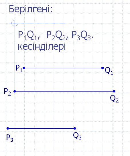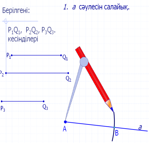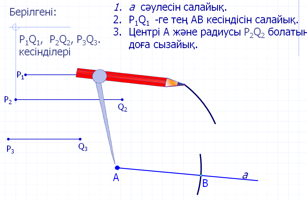 .1.2.16 берілген бұрышқа тең бұрыш салу, бұрыштың биссектрисасын салу, кесіндіні қақ бөлу; 7.1.2.17 кесіндінің орта перпендикулярын және берілген түзуге перпендикуляр түзу салу; 7.1.2.18 берілген элементтері бойынша үшбұрыш салу; |