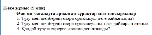 Оқулықты оқып танысып шығады. Тірек сөздермен танысып, өз дәптерлеріне жазып алады. Түзу мен шеңбер: