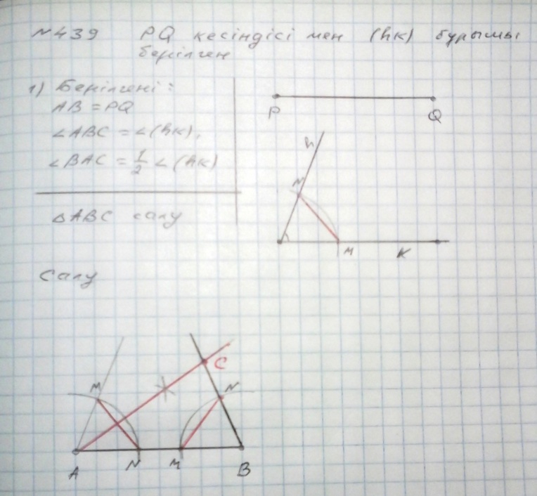 берілген бұрышқа тең бұрыш салу, бұрыштың биссектрисасын салу, кесіндіні қақ бөледі. кесіндінің орта перпендикулярын және берілген түзуге перпендикуляр түзу салады. берілген элементтері бойынша үшбұрыш салады. |