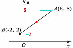 Есеп 1 A(6, 8) және B(-2, 2) нүктелерін қосатын кесіндінің ортасының ординатасын табыңыз. Шешуі: