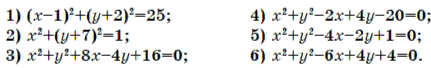 №4.40 есеп 1) х2+у2=9; 2) (x–1)2+(y+2)2=4; 3) (x+5)2+(y–3)2=25; 4) (x–1)2+y2=4 5) x2+(y+2)2=2; 6) (x+2)2+(y+3)2=3 теңдеулерімен берілген шеңберлердің центрлерінің координаталарын және радиустарын анықтап, графиктерін салыңдар. |
