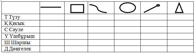 2.3.1.1.Геометриялық фигуралармен танысу және түсінік беру. 2.3.1.2.Геометриялық фигураларды ажырату. 2.3.1.1.Бұрыштар түрлерін атау,сызуға үйрету. 2.3.1.2.Көпбұрыштарды төбелер саны бойынша жіктеу. |