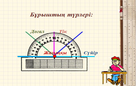 Жарайсыңдар! Балалар. 5.Ережелер. Бір нүкте бойы жүргізілген түзу сызықты Сәуле деп атаймыз. Екі нүктемен шектелген түзудің бөлігін Кесінді дейміз. Сәуле мен кесіндіні сызғышпен өлшейді. Бұрыш. Бұрыш – бұл бір нүктеден шыққан әртүрлі екі сәуледен құралған фигура. Бұрыш 3 түрге бөлінеді.Қандай? Тік бұрыш,Сүйір бұрыш, Доғал бұрыш. Кез келген бұрышты Транспортирмен өлшеп сызады. 90 градус шамасындағы бұрыш Тік бұрыш деп аталады. 90 градустан кем бұрышты Сүйір бұрыш деп атайды. 90 градустан артық бұрышты Доғал бұрыш деп атайды. Көпбұрыш. Көпбұрыш – жазықтағы фигура,барлық қабырғалары тең,барлық бұрыштары тең геометриялық фигураны айтады. Тұйықталған сынық,оған сырттай және іштей шеңбер сызуға болады. Тіктөртбұрыш. Тіктөртбұрыш – бұл барлық бұрыштары тік болатын төртбұрыш. Шаршы. Шаршы - бұл барлық қабырғалары тең болатын тіктөртбұрыш. Үшбұрыш. Үшбұрыш – бір сызықтың бойында жатпайтын үш нүкте белгілеп қосқанда үшбұрыш деп аталатын геометриялық фигураны айтады.Үш төбесі,үш қабырғасы бар. Төртбұрыш. Төртбұрыш – барлық қабырғалары тең геометриялық фигураны айтады. 6.«Ойнада ойла» ойыны.Топтық сайыс. Жазық геометриялық фигураларға қандай фигуралар жатады екен? (Тік төртбұрыш,Үшбұрыш,Шаршы,Шеңбер,Көпбұрыш) 7.Сұрақ – жауап сәті. 1.Негізгі геометриялық фигура қалай аталады? (нүкте) 2.Үшбұрыштың неше бұрышы бар? (3) 3.Бұрыштарды атап бер? (Тік,сүйір,доғал бұрыштар) 4.Төртбұрыштың неше бұрышы бар ? (4) 5.Геометриялық фигураларды қандай өлшем құралымен өлшейді? (Сызғыш пен Транспортир) 6.Ұзындық өлшемін ата. (Метр,дециметр,сантиметр,милиметр)
