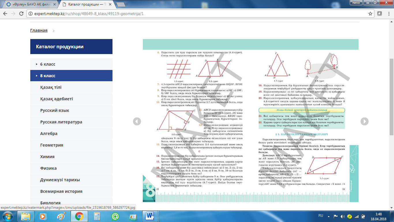 8.3.1.3. Параллелограмм анықтамасын білу; 8.3.1.4. Параллелограмм қасиеттерін қорытып шығару және қолдану; |