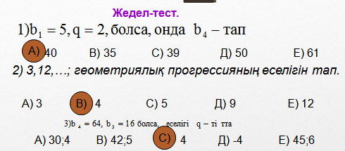 Дамытушылық:Оқушыларды геометриялық прогрессияның еселігі, n-ші мүшесі, алғашқы n мүшесінің қосындысының формуласын қолдана білуге дағдыландыру.