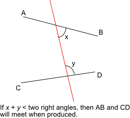 Егер екі түзуге түсетін түзу бір жағынан екі түзуден кіші ішкі бұрыштарды құраса, онда егер екі түзу шексіз түзілсе, онда олар бұрыштары екі түзу бұрыштан кіші жағында кездеседі.