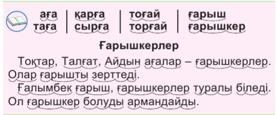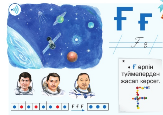Оқушылар сюжетті сурет бойынша әңгіме құрайды: «Ғарышта ауа болмайды. Онда барлық заттар қалқып жүреді. Ғарышқа ұшатын адамды ғарышкер деп атайды. Ғарышта скафандр кию қажет».