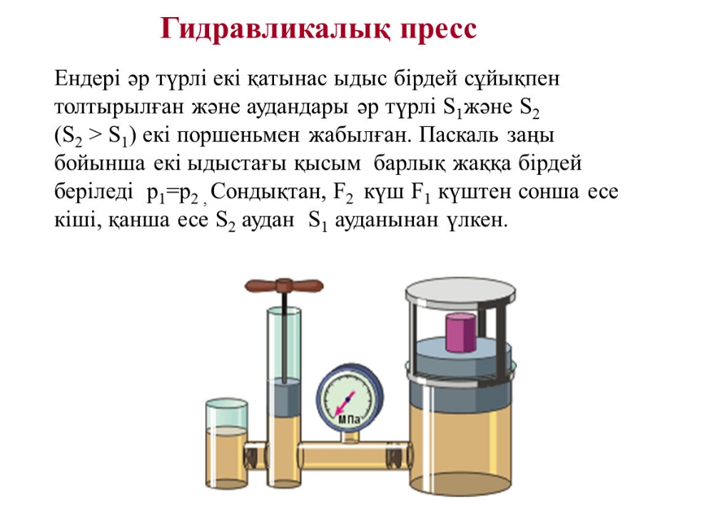 «Гидравликалық пресс » функционалдық сауатылық тапсырмасы 1. Гидравликалық пресс туралы түсінік: Гидравликалық пресс — сұйықтықтың қысымын пайдалана отырып, үлкен күшті жасауға арналған құрылғы. Оның жұмыс принципі Паскаль заңы бойынша жұмыс істейді, яғни сұйықтықтағы қысым біркелкі бөлінеді.