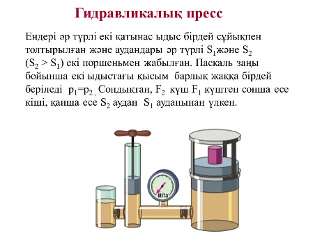 Дескриптор: Гидравликалық машиналардың негізгі формуласын біледі; Гидравликалық машиналардың жұмыс істеу принципін сипаттай алады; Гидравликалық машиналарды қолдану кезіндегі күштен ұтысты есептей алады; Гидравликалық машиналардың негізгі формуласын біледі;