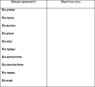 Ең, ең (оқушылардың ойлау қабілетін және шапшаңдылығын дамыту) 1) Ең үлкен мұхит – Тынық мұхиты. 2) Ең кіші мұхит – Солтүстік Мұзды мұхит. 3) Ең үлкен материк – Еуразия. 4) Ең кіші материк – Аустралия. 5) Тынық мұхитының ең терең жері – Мариан шұңғымасы. 6) Ең ыстық материк – Африка. 7) Ең салқын материк – Антарктида. 8) Ең жылы мұхит – Үнді мұхиты. 9) Ең үлкен арал – Гренландия. 10) Ені ең кең (950км) және терең (5248м) бұғаз – Дрейк бұғазы. 11) Ең ұзын бұғаз – Мозамбик. |