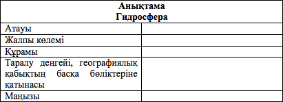 http://bilimland.kz/kk/content/structure/2064-geografiya_kk#lesson=14037. Мағынаны тану. «Ой шарлау» стратегиясы. Анықтама. Келтірілген дәйектерді қорытындылай отырып гидросфера анықтамасын жасау.