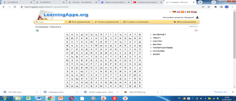 1.«Сөздерді табыңыз» топпен жұмыс. LearningApps.org –та берілген тапсырманы QR кодпен сканерлеу арқылы тапсырма орындайды.