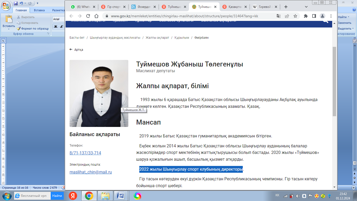 Сонымен қатар өзіміздің жерлесіміз Батыс Қазақстан облысы Шыңғырлау ауданы Ақбұлақ ауылында дүниеге келген Туймешов Жұбаныш гір тасын көтеруден екі дүркін Қазақстан Республикасының чемпионы. Гір тасын көтеру бойынша спорт шебері. 2008-2009 жылдары Облыстың ІІІ дүркін чемпионы. 2009 жылы Республикалық Қазақстан Чемпионатына жолдама алып, сол жолдама арқылы қатысып Қазақстан Республикасының Күміс жүлдесін иеленді. ІІ дүркін Қазақстан Чемпионы атанды және «Спорт шебері» атағына ие болды. Колледж қабырғасында оқи жүре көптеген Республикалық жүлделерді жеңіп алды. 2013 жылдың күзінде ҚР Астана қаласындағы «Республикалық Ұлан» әскер қатарына алынды. Әскер қатарында жүріпте жарысқа қатысу үшін дайындықтар жасап, Республикалық 7 жарысқа қатысып жүлделі орындарға ие болды. Қазіргі таңда Шыңғырлау ауданының «Балалар жасөспірімдер спорт мектебінде» гір спортынан жаттықтырушы қызметін атқаруда. [9]