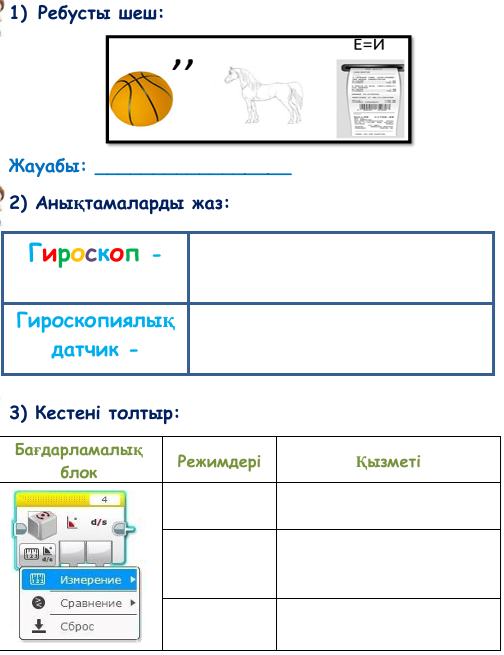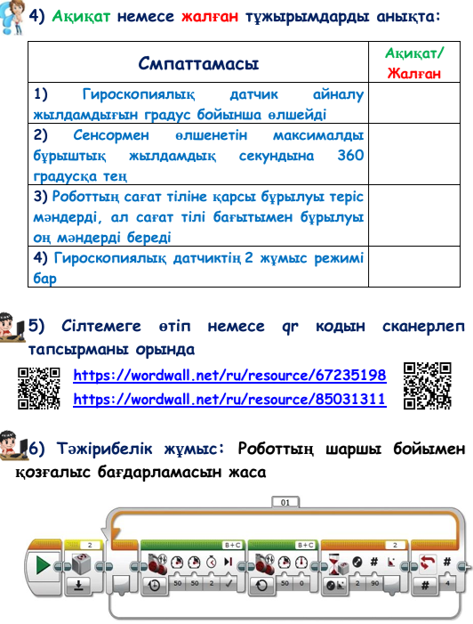 Дескриптор: - ребусты шешеді - аныұтамаларды жазады - гироскопиялық датчиктің тиісті режимдер мен қызметін жазады Сергіту жаттығуларын орындайды - ақиқат немесе жалған тұжырымдарды анықтап жазады - интерактивті тапсырманы орындайды - роботқа бағдарлама құрады |