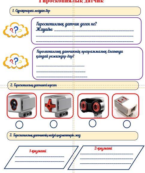 Жаңа білім білімін зерттеп, берілген сұрақтарға жауап беру: 1. Датчиктің неше түрі бар? 2. Гироскопиялық датчик қандай қызмет атқарады? 3. Гироскопиялық датчик робот жұмысында неге маңызды? 4. Гироскопиялық датчик корпусының жоғарғы жағын дағы екі қызыл бағыттауыш жебе не үшін қажет? Білімді бекіту