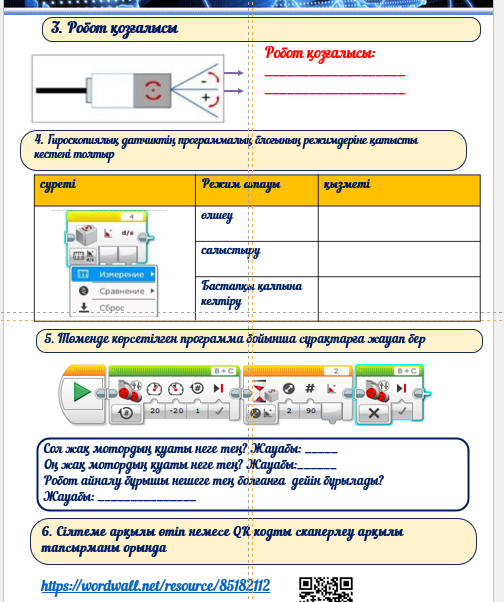 Оқулықпен жұмыс жасайды Видеосабақты қарайды Топпен жұмыс жасау, тапсырмаларды орындайды Дескриптор: - сұрақтарға жауапбереді - гироскопиялық датчикті анықтайды - гироскопиялық датчиктің негізгі қызметтерін жазады Сергіту жаттығуларын орындайды - робот қозғалысы - режим қызметтерін анықтайды - роботқа бағдарлама құрады -интерактивті тапсырманы орындайды |