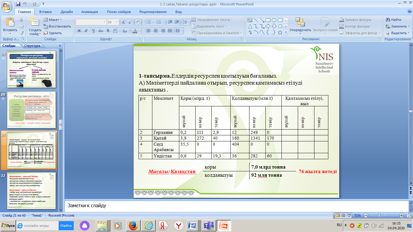 Талқылау сұрақтары: 1. Қазақстанда атқарылып жатқан табиғатты қорғау шараларындағы жеке тұлғаның рөлін қалай бағалайсың? 1-тапсырма.Елдердің ресурспен қамтылуын бағалаңыз. А) Мәліметтерді пайдалана отырып, ресурспен қамтамасыз етілуді анықтаңыз .