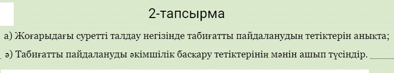 Миға шабуыл ( Ой-талқы. - Сіз тағатты қалай қолданып жүрсіз? - Табиғатқа экологиялық зиян келтіпмеу үшін не істеу керек деп ойлайсыз? Мәтінмен жұмыс: Адам мен табиғаттың өзара әсерін реттеудің экологиялық құқық нормалары мәтінді топта талдайды. Оқушылар ДЖИГСО әдісі арқылы мәтінді келесі топқа түсіндіреді. Мәліметтерді пайдалана отырып әр сектордағы шаруашылықты жүргізуде табиғат ресурстарын қалай қолданатынын анықтайды. Анықтаған табиғат ресурстарын қалай тиімді қолдану механизімін құрастырады. Әр топтан спикерлері сыныпқа түсіндіреді. Дескрипторы: Экологияны ластануды азайту жолданын талдайды. Табиғатты тиімді қолдану жолын ұсынады. Бағалау: топтық бағалау бағдаршам әдісі арқылы бағаланады. Кері байланыс Нені білдім, жетілдіруім қажет,сұрағым бар әдісі арқылы жүргізіледі 1-тапсырма а)