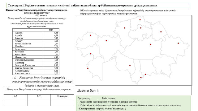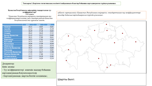 Географияның зерттеу әдістерін біледі, түсіндіре алады Географиялық деректерді талдайды Белгілі бір географиялық нысанның моделін жасайды ұсынатын моделдердің критерийлерін жасайды |