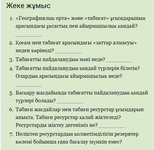ЖЕКЕ ЖҰМЫС Табиғат ресурстарының анықтамасын жазыңыздар. Ресурсты экономикалық, экологиялық тұрғыдан бағалаңыздар.