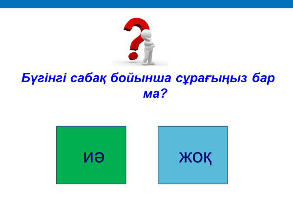 Слайдта көрсетілген ресурстарды талқылайды Слайдта берілген сұрақ жауапты орындайды Сұрақ жауап арқылы сұраққа жауап береді, логикалық ойлай білуі мен сыни көзқарасы таныта білу дағдылары қалыптасады |