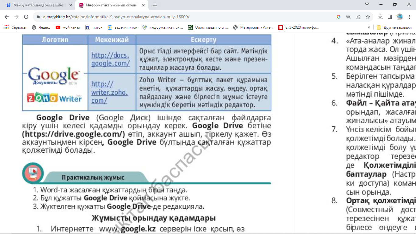 1. Google Docs қызметі қандай бұлтты қызметтер ұсынаалады? 3. Google Drive бұлтын пайдалануқандай алгоритмдердентұрады? 4. Құжатқа барлық Интернет қолданушыларға қолжетімді болу үшін қандай командаларды орындаукерек? |