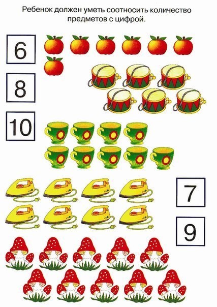 Знать цифры. Считать от 1 до 10, восстанавливать числовой ряд с пропусками. Обратный счёт от 5 до 1, выполнять счетные операции в пределах 10.
