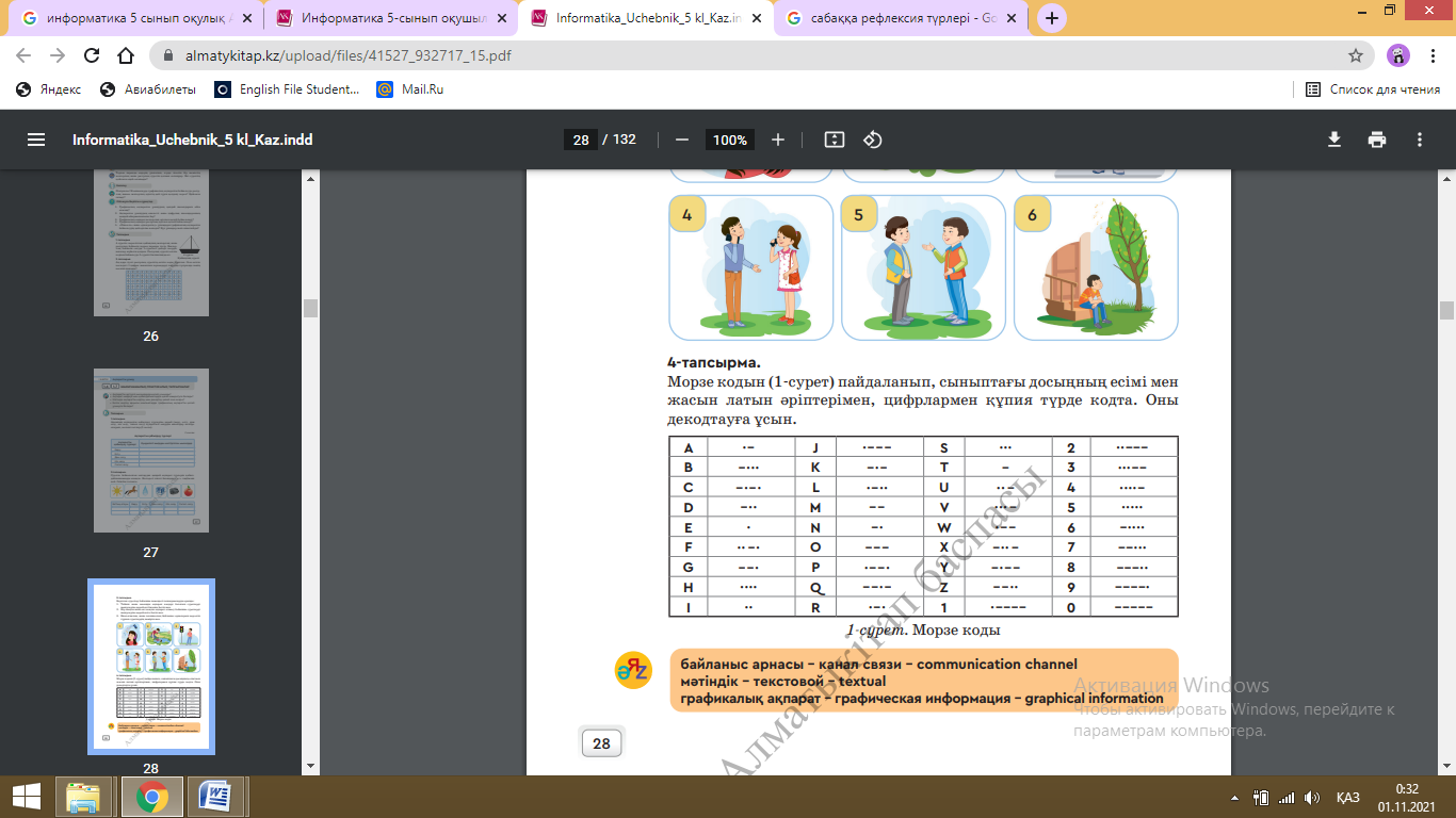 Практикалық жұмысы: 1-тапсырма. Морзе кодын (1-сурет) пайдаланып, сыныптағы досыңның есімі мен жасын латын әріптерімен, цифрлармен құпия түрде кодта. Оны декодтауға ұсын.