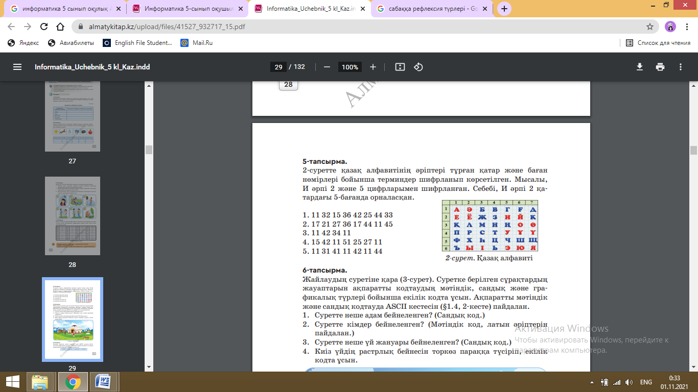 5.2.1.5 Компьютерге арналған барлық ақпарат екілік түрінде ұсынылғанын түсіндіру. Екілік кодтау – Двоичное кодирование – Binary coding |