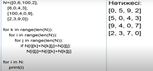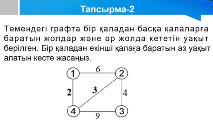 Дескриптор: -жолдар уақытын есептейді - аз уакыт алатын кесте жазады - графтарды программалауда қолданады.